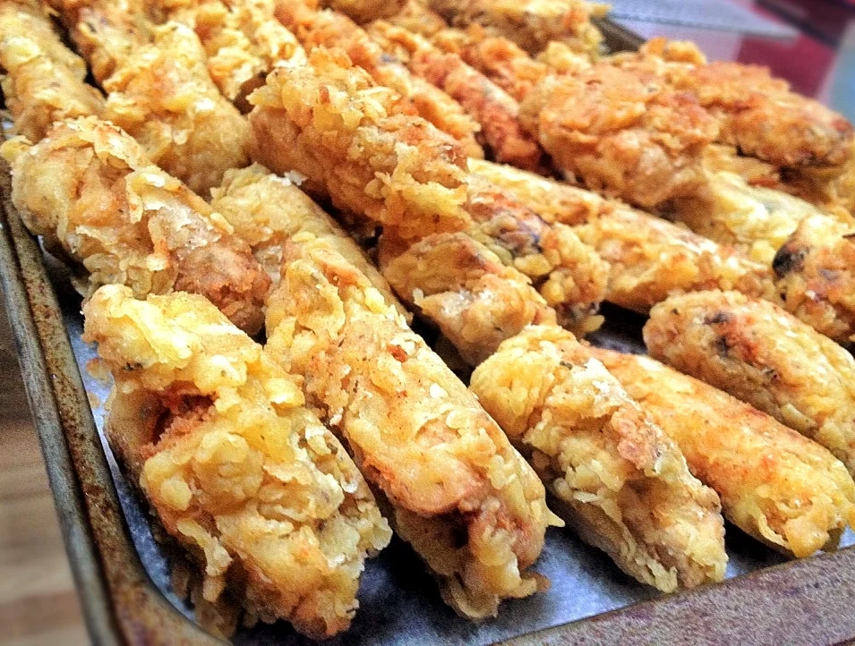 4. Put the BBQ or Buffalo Wings sauce in a small bowl and dip each side of the cooled fried chick’n until it is well coated. Cover a broiler pan with aluminum foil and place the chick’n on the pan. Broil each side under high heat until crispy. Or, just dip them in the sauce and eat!