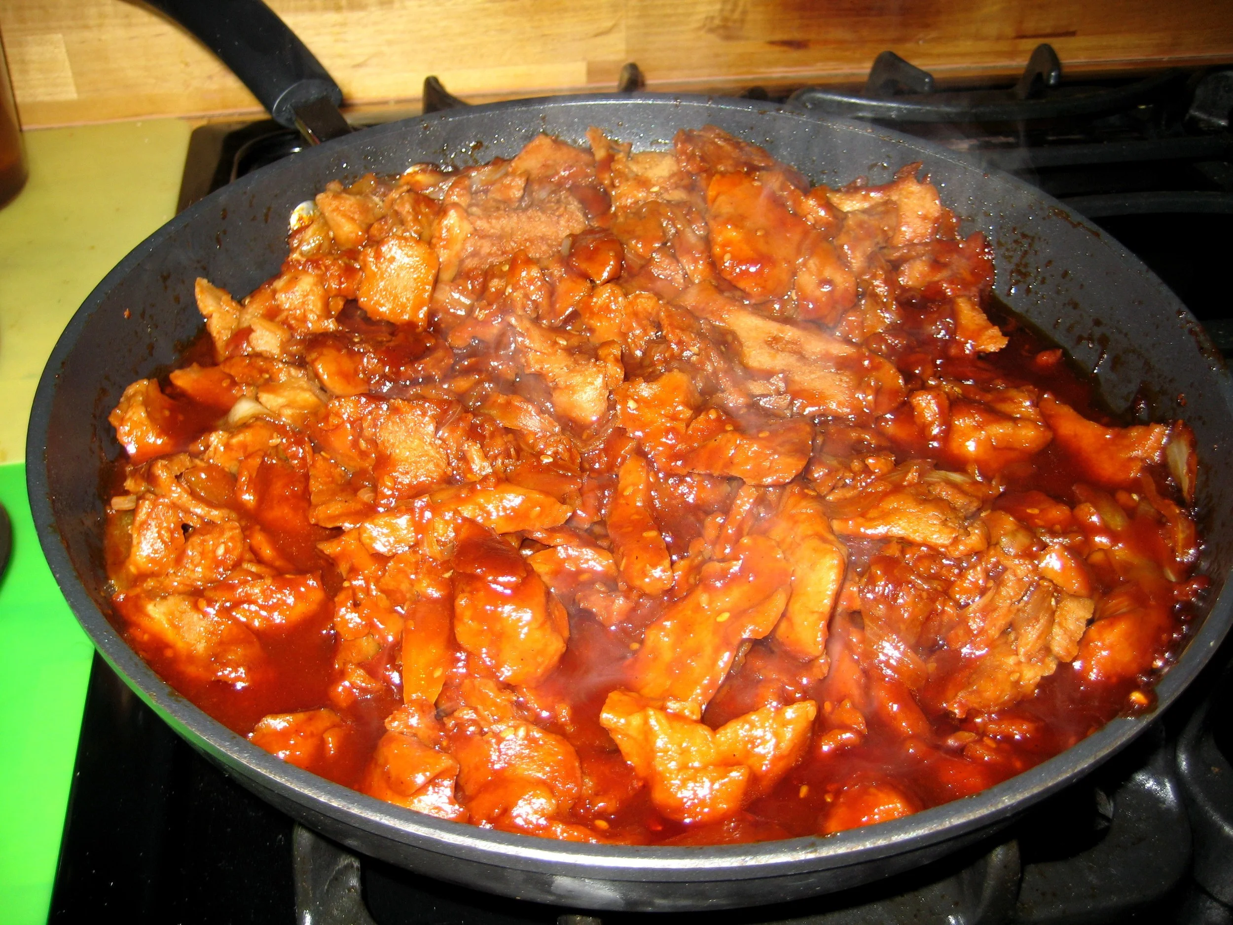 Be sure to check every few minutes and use a spoon to "pat down" the seitan pieces when they "fluff up." Also make sure that no pieces are sticking to the bottom or sides of the pan.
