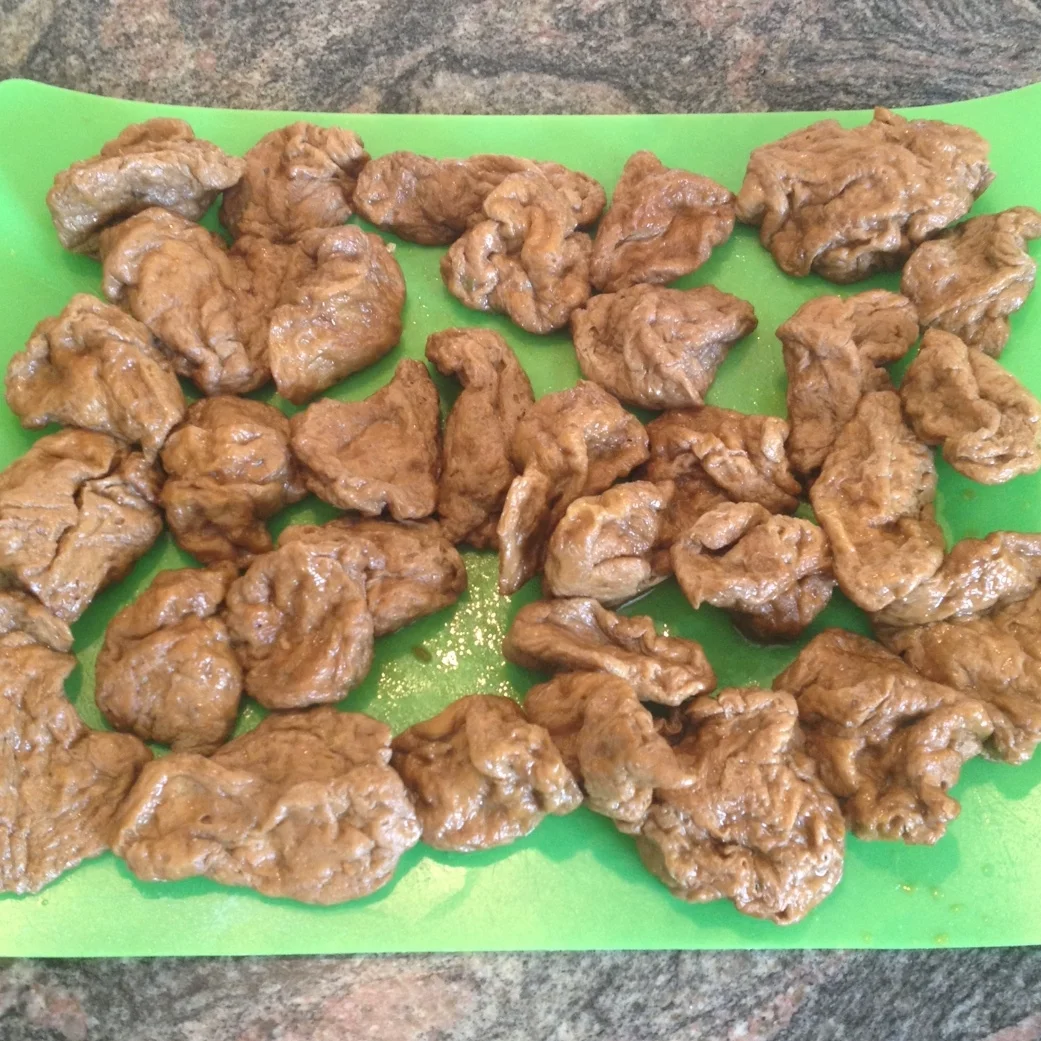 Step 8: After about an hour, there should be very little liquid left in the pan. Remove the seitan pieces and let them drain and cool. After cooling, squeeze out excess liquid.