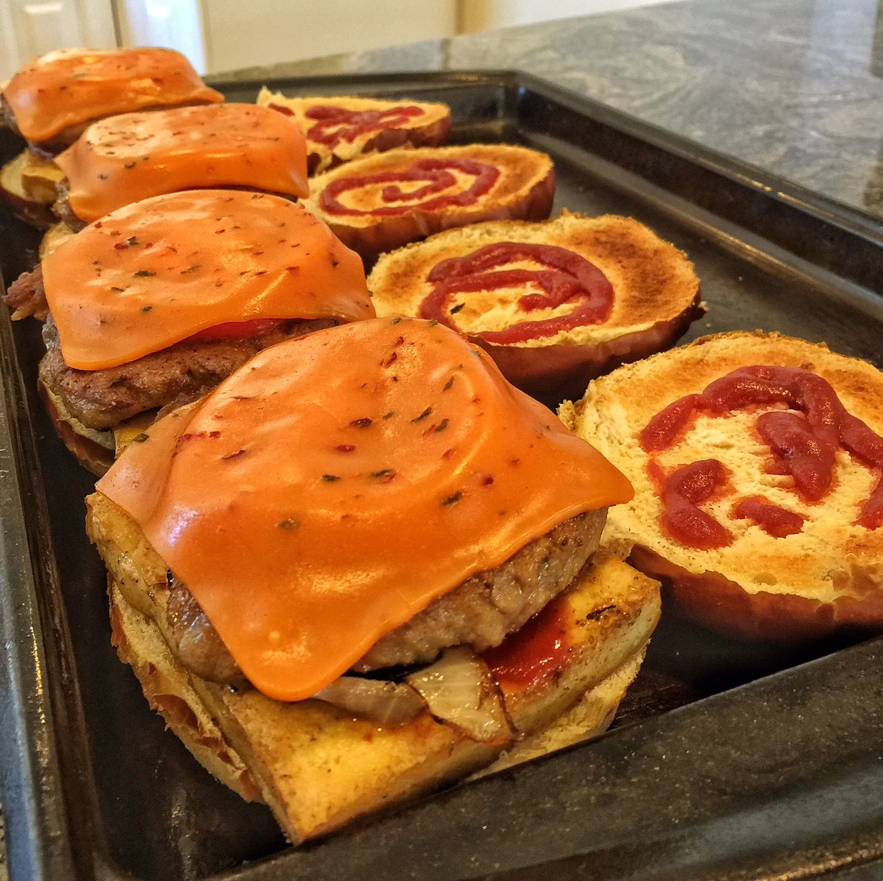 - Place sandwiches, open faced, on a cookie sheet. Add ketchup to the top bun. Oven broil on high for a few minutes until the cheese is melted.