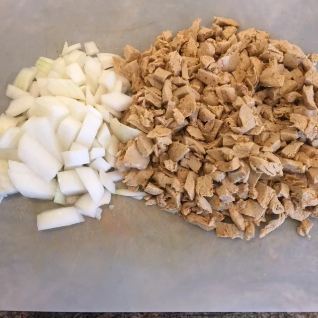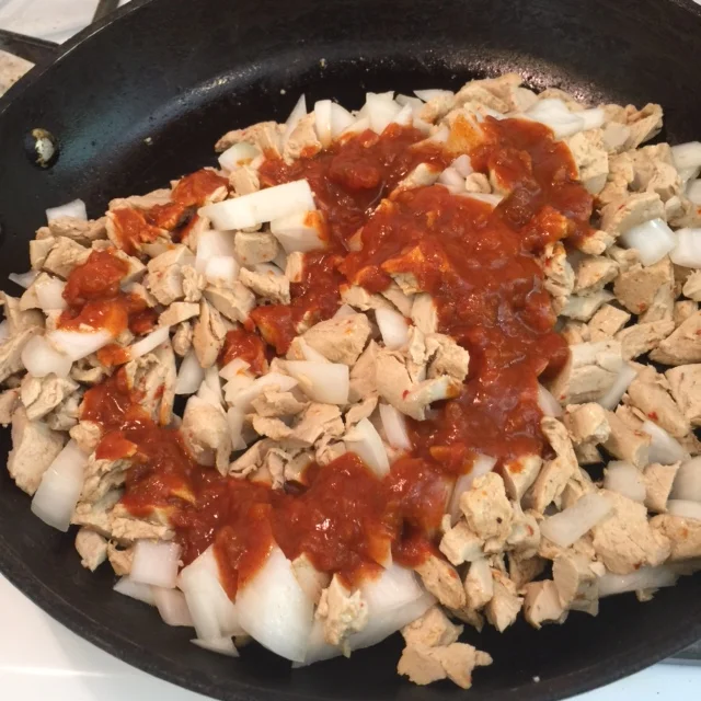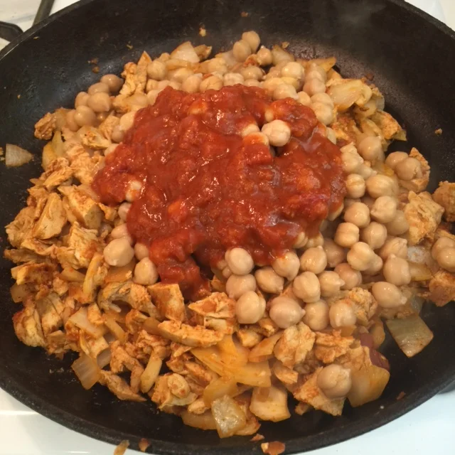 - Chop the Chicken-less Strips and onion. Sauté with a bit of oil and a couple tablespoons of the Curry Simmer Sauce. When the Chicken-less pieces are a bit crispy, add the garbanzo beans and continue to cook for about 2 minutes, adding a bit more Curry Simmer Sauce. Transfer to a large bowl.