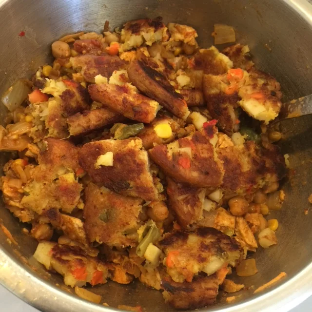 - Add the cooked Vegetable Masala Burgers to the chick'n/garbanzo bean mixture. Cut the burgers up a little so that they are in large chunks.