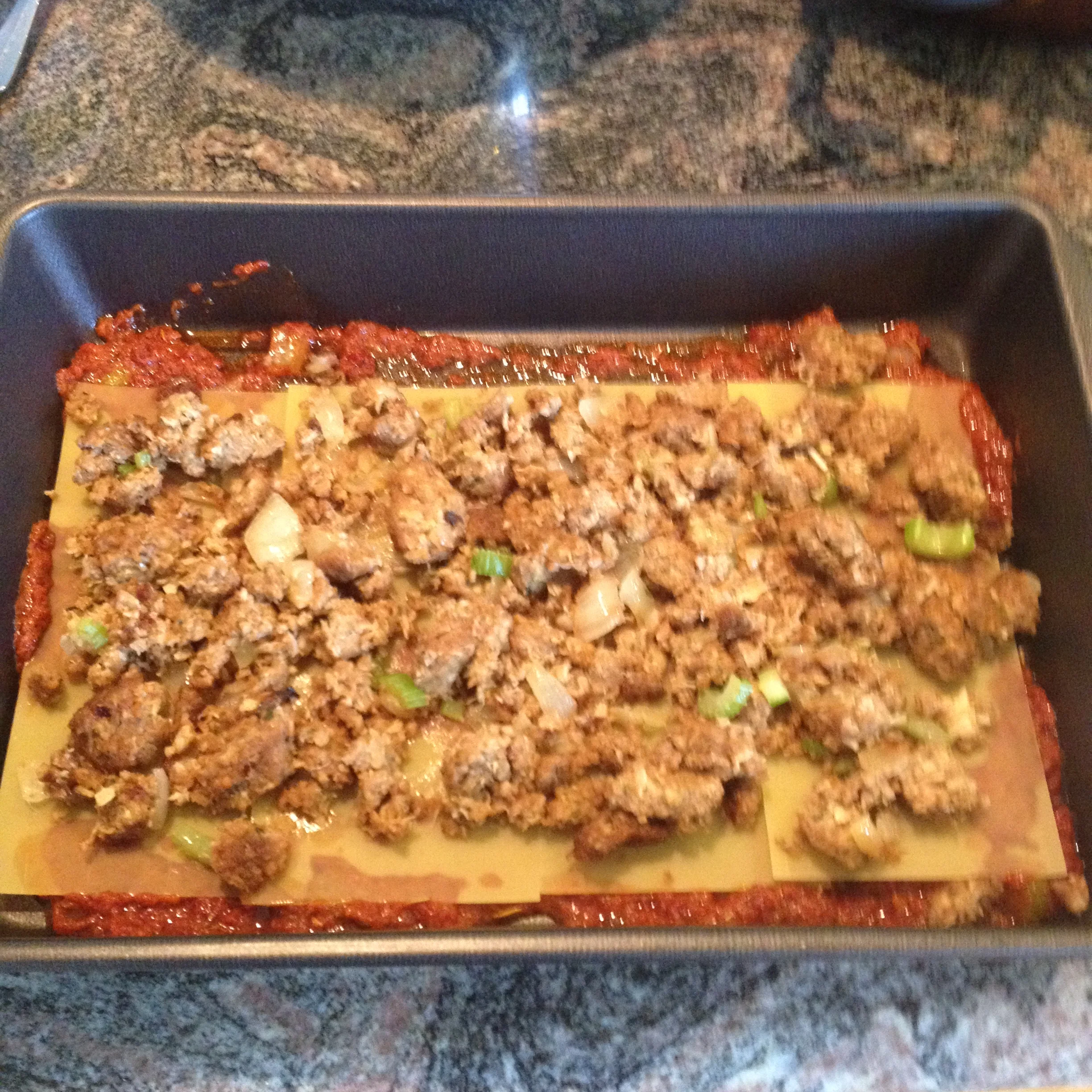 Repeat this process. To end, add noodles, a little sauce and a good amount of vegan cheese.